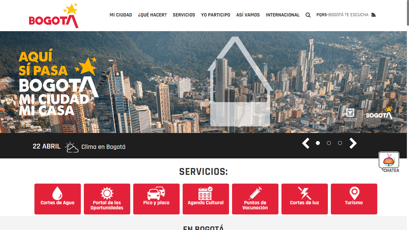 Como parte del equipo de desarrollo del Portal Bogotá, pude aportar en la reestructuración visual de algunos componentes frontend del Home con el fin de mejorar la experiencia y renovar la apariencia, principalmente en dispositivos móviles. Además, aporté en la construcción de una nueva propuesta de diseño UI para todo el sitio, la integración de un componente dinámico actualizado mediante APIs externas, y el desarrollo de dos plantillas de micrositio para la difusión de información especial.